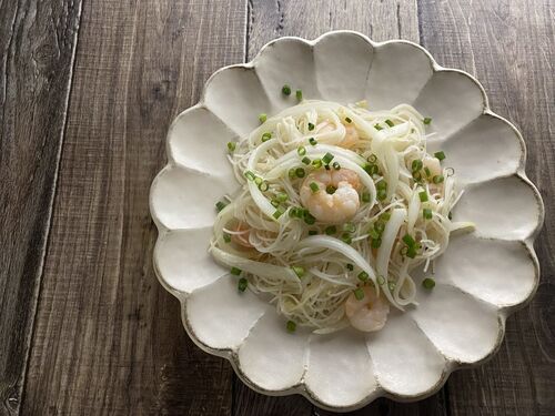 米粉で作られた麺のビーフン プリプリのエビと甘味のある玉ねぎをエスニックな味付けでいただきます